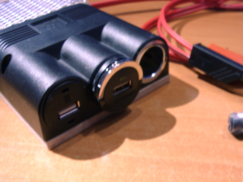 Da man für das Handy und den Sender jeweils einen 5V-USB-Anschluß braucht, habe ich in die mittlere Dose einen Adapter gesteckt.