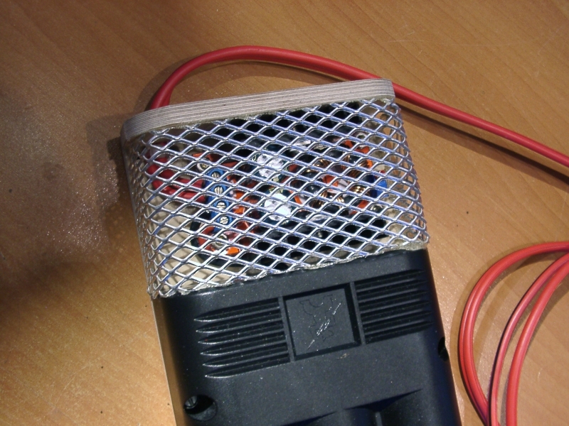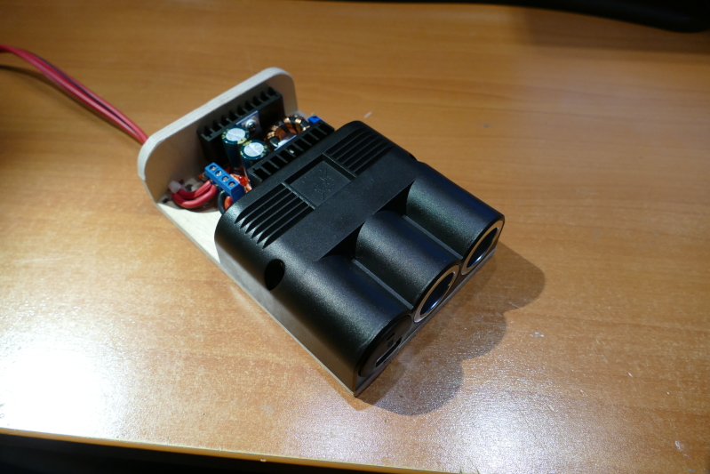 Mit dem Teil funktioniert jetzt alles wunderbar. Aber was in aller Welt ist das? Der Patch besteht im Wesentlichem aus einem Step-Up-Wandlermodul vom "Chinesen" verkauft bei Amazon, einer KFZ-Dreifachsteckdose, einem 12V Zigarettenanzünder-auf-USB-Adapter, etwas Holz und etwas Gitter.