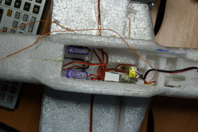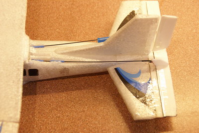 Hier sieht man gut, wie die beiden Servos seitlich an die Innenseiten des Rumpfes geklebt wurden. |