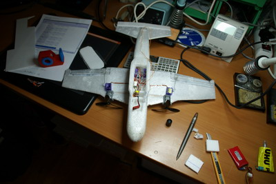Da es im Rumpf etwas eng zugeht, habe ich zuerst die Karbonstange mittig zersägt und die beiden Teile jeweils mittels einem Stück Schrumpfschlauch an die Ruderhörner der Servos befestigt. Das geht mit einem elektronisch regelbaren Lötkolben super, denn da kann man die Temperatur so einstellen, daß der Schrumpfschlauch schrumpft, aber das Ruderhorn nicht schmilzt. Auf der Oberseite des Airlifters werden nun die beiden Löcher geschnitten, durch die die beiden Carbonstäbe zum Leitwerk gehen sollen. Die Löcher müssen nicht besonders dick sein, sondern nur vorhanden. Die beiden Servos werden wie auf dem Bild gezeigt in die Rumpfinnenwand mit Uhu-POR eingeklebt (Ablüften lassen!). Nun kommen die Wattestäbchen dran. Die Watteenden werden mit einem scharfen Cuttermesser vorsichtig entfernt, ohne die Röhrchen zu deformieren. Die Wattestäbchenröhrchen werden nun wieder in der Mitte geteilt. Jeweils zwei Röhrchen werden nun von hinten über die beiden Karbonstäbe gesteckt und so weit in die Löcher im Epp-Rumpf gesteckt, dass sie wie Lager für die Karbonstäbe dienen. Wenn alles richtig gemacht wurde, ist das Rudergestänge nun sehr leichtgängig und hat trotzdem kaum Spiel. Vor den Servos findet der Empfänger seinen Platz. Vorher die Verkabelung fertig machen. |