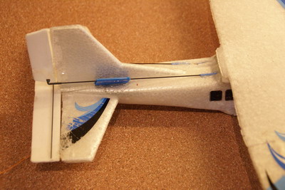 Mit Depron werden nun die Ruder des Leitwerks geformt. Die Scharniere bestehen aus Tesa-Band. Die Ruderhörner werden an die Ruder geklebt. Gegebenenfalls, falls das Gestänge zu wackelig ist und ausweicht, hilft es, ein weiteres Stück Wattestäbchen-Röhrchen auf das entsprechende Carbonstäbchen zu stecken und das Röhrchen durch ein Stück Depron zu stabilisieren. Siehe Foto von Seitenruder-Anlenkung. Die Carbonstäbe werden nun genau so abgelängt, dass in der Neutralstellung der Servos die Ruder auch neutral stehen. Anschließend wird mit jeweils einem Schrumpfschlauch ein Carbonstab mit dem Ruderhorn verbunden. |