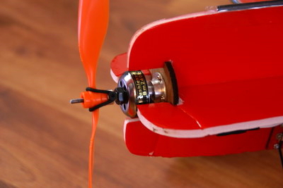 Der Motor ist ein "BM2408", ein China-Motor, der zwar nicht der Brüller von der Leistung, aber dafür recht günstig ist. Die Eckdaten: 47g Gewicht, 2s..3s Spannung (7,2..12,6V), 13A Stromaufnahme max. Original ist die Luftschraube über die lange Motorwelle gesteckt und mit einer Schraube gesichert. Hier im Bild ist schon einmal der Propsaver als Befestigung dran. Die Welle braucht einen Waffenschein.