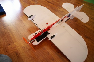 Als ich das Ding aus dem Karton gezogen habe war ich auch schon begeistert. Die GeeBee sieht wirklich sehr schön aus. Sie wird mit einer 4-Kanal (billig-) Fernsteuerung geliefert, die leider nicht Graupner-kompatibel ist. Außerdem waren zwei 2000er Lipo-Akkus der Marke "Noname", ein Balancer-Ladegerät und ein Fähnchenklip für die Sendeantenne.