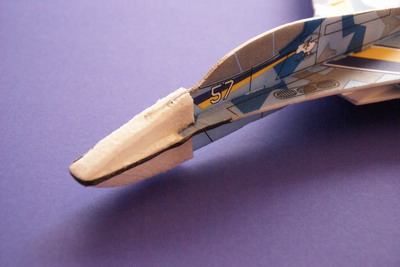 Nach der ersten Nasenlandung habe ich das Gewicht doch noch erhöhen müssen. Statt der Originalnase kommt nun eine EPP-Nase zum Einsatz, die in Zukunft den Knitternasenlook vermeiden soll. Die EPP-Nase ist durch ein leichtes Karbon-Roving seitlich verstärkt, da hier die Geometrie des Flugzeugs keine effektive Kraftverteilung zulässt.