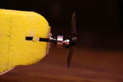 Mein erster Versuch lief auf Leichtbau hinaus. Ich wollte einfach die Schnuransteuerung testen. Als Motor kam wieder der Xoodee Nano (Brushless-Motor mit 9,5g, 7,2V, 5A). Eine Luftschraube mit 7x6 sorgt für die nötige Kraft.