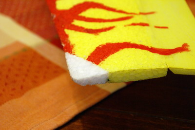 Nun probierte ich einen Tipp aus dem Internet. Demnach wird die angefressene Stelle definiert mit dem Cuttermesser ausgeschnitten. Anschließend wird ein entsprechend großer EPP-Block mit Uhu-POR an die kaputte Stelle geklebt. Nach dem Kleben wird mit dem Cuttermesser die Form wieder hergestellt. Es klappt perfekt! Wichtig ist nur dabei, daß man ein wirklich scharfes Cuttermesser verwendet und dass der Uhu-POR ablüften muß.