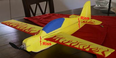 Wer fliegen lernt wird auch bald die zweite Sollbruchstelle gefunden haben: Vorne, wo die Epptasy immer den Boden abtastet. Auch hier bildete sich nach heftigen Aufschlägen ein Riß. Die Vermeidung geht wie oben beschrieben.