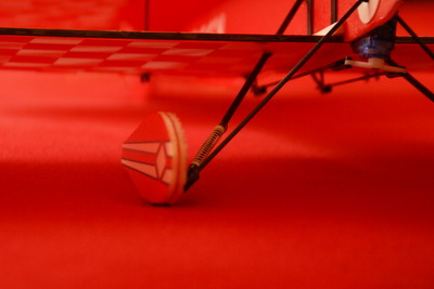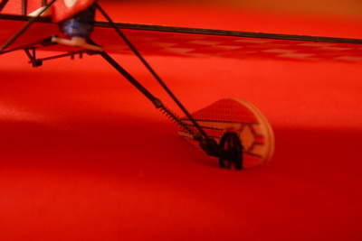 Das Fahrwerk ist beim Original zwar über die untere Tragfläche flexibel verbunden, aber das bedeutet, daß jede harte Landung den Rumpf perforiert. Das nervt auf Dauer. Deshalb habe ich diesmal aus Karbonrohr und passenden Karbonstab einen Stoßdämpfer gebaut. Die Federn stammen aus zwei Kugelschreibern. Mal sehen, was das bringt. Das Fahrwerk kann jedenfalls jetzt federn.