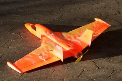 Als Akku habe ich nun letztendlich einen 3s 800mAh eingebaut. Der reicht für 11 Minuten Flugzeit. Der Funjet kann ganz langsam fliegen aber auch noch verblüffend schnell werden. Die Tiptanks habe ich mit Klett abnehmbar gemacht. Allerdings ist das bei der niedrigen Landegeschwindigkeit nicht nötig - im Gegensatz zum Twister, der gerne einmal in ein Grasbüschel einhakt und sich dann durch den Restschwung selbst beschädigt.