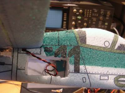 Daß der Bausatz nur so wenig Teile hat, hat gute und weniger gute Aspekte. So ist zum Beispiel der Rumpf aus einem Stück. Fein! da geht der Baufortschitt recht schnell - bis zum Einbau der RC-Komponenten Regler, Empfänger und Batterie. Denn hier müssen die Löcher dann selbst in den Rumpf geschnitten werden. und jedes Loch schwächt die Struktur. Also lieber gleich richtig. Und da fängt das Problem an. Wo die Komponenten plazieren, damit der Schwerpunkt später ohne Ballast richtig sitzt.