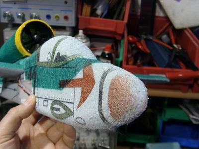 Bevor man mit dem Kleben beginnt, ist es vielleicht ganz gut, zumindest den Rumpf auf einen Flachbettscanner zu legen und die so gescannten Seiten zu sichern. So kann man die "Bemalung" jederzeit auf Klebefolie nachdrucken, wenn man Löcher abdeken möchte oder Beschädigungen kasschieren will.