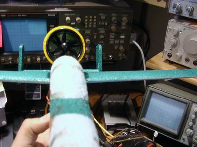 Die Düse wird vom Plan her so gebaut, daß der Impeller direkt in das EPP-Formteil eingeklebt wird. Ich bin von dem Vorschlag abgewichen und haben den Impeller mit einer PE-Folie (Overheadfolie) so verbunden, daß ein glattes Schubrohr entsteht. Die drei Kabel vom Motor habe ich wegen der Ströhmung in einen Schrumfschlauch gesteckt. Dieser vorbereitete Antriebsstrang kam dan von vorne in das EPP-Formteil gesteckt. Sieht original aus, ergibt aber einen aalglatten Düsenauslass.