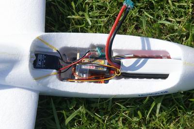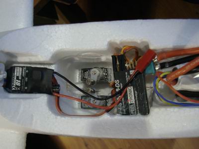 (Leiitwerk ist auf diesem Bild links, die Nase rechts) Links der Regler, dann die beiden Servos, Empfänger, Akku