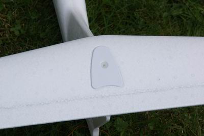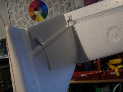 Auf diesem Bild ist der Höhenleitwerksaufnehmer zu sehen. Ein ABS-Kunststoffteil ist mit dem Schaum verklebt. In dieses Teil wird eine Nylonschraube eingeführt (Kreuzschlitz...brav!) und festgezogen. Das Gegenstück ist ein gerippter Nylon-Zylinder mit Innengewinde, der in das Seitenleitwerk eingeklebt wird. Damit diese Einpukt-Befestigung nicht verrutschen kann, hat das Seitenleitwerk noch eine Schaumnase, die in eine Vertiefung in dem Seitenleitwerk eintaucht. Damit ist die Positionierung festgelegt.