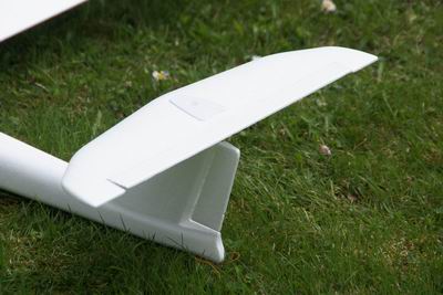 Das größere Seitenruder bewirkt eine leichte Verbesserung im Ansprechverhalten, aber die Gesamtsituation ist damit nicht besser. Ich habe das Teil wieder abgebaut, da sonst die Rookie beim Transport nicht mehr in den Karton paßt.