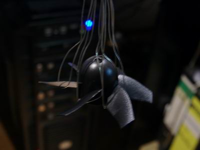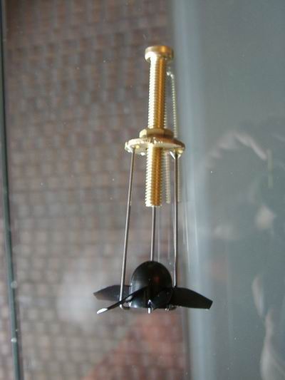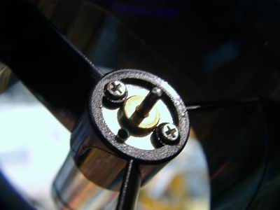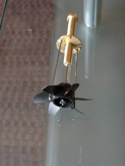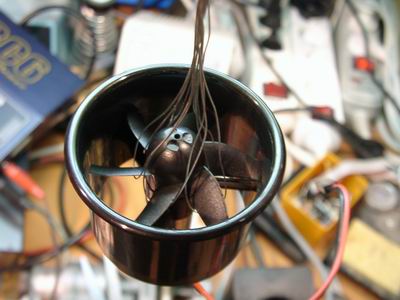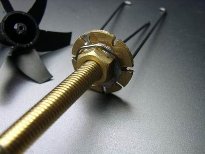 Die Schlingen werden auf der offenen Seite verlötet. Das Prinzip ist so, daß der Draht beim stehenden Impeller durch den Spalt zwischen Rotor und Stator gefädelt werden kann. So greifen die 6 Schlingen gleichmäßig die 6 Rotorblätter. Durch die gleichen Längen ergibt sich ein gleichmäßiger Zug.