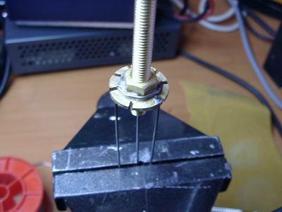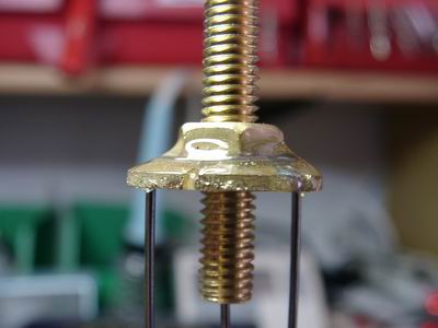 Dann habe ich eine Messing-Unterlegscheibe eingeschlitzt, und mit einer M6-Messing-Mutter verlötet. Das geht am Besten, in dem man die Mutter mit der Scheibe und einer zweiten Mutter auf eine Edelstahlschraube schraubt. Edelstahl ist nicht verlötbar (weichlötbar).