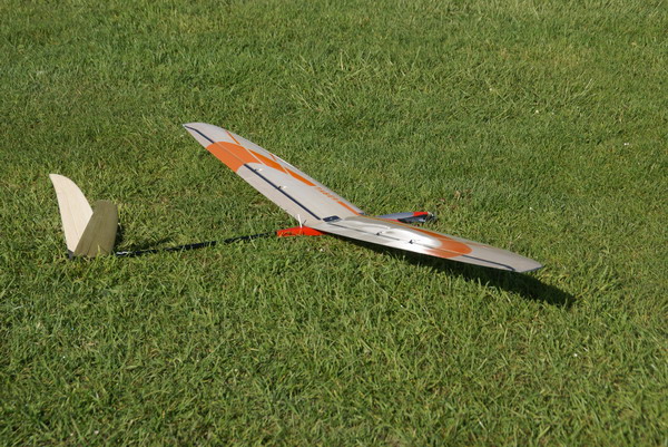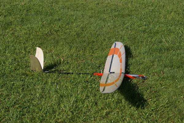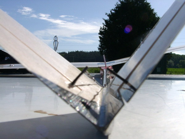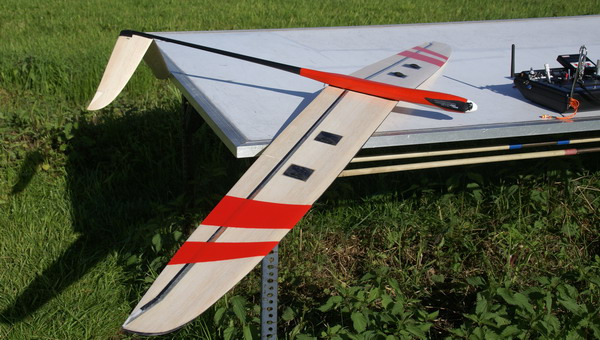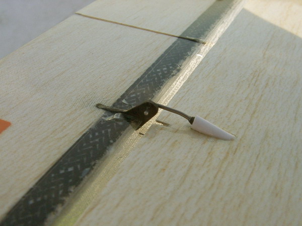 Im nachfolgenden Bild ist die Anlenkung des V-Leitwerks zu sehen. Die Anlenkung ist mit Kevlar-Fäden realisert. Das Ruder wird aktiv ausschließlich über diesen Faden gezogen. Die Stellung des Ruders in die Gegenrichtung wird mit einer Feder (Federstahl) vollzogen. Das spart Gewicht und ist spielfrei. Allerdings ist das Nachjustieren nicht möglich.