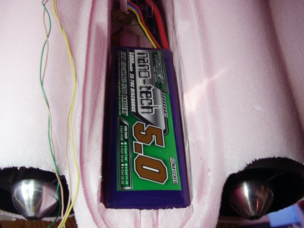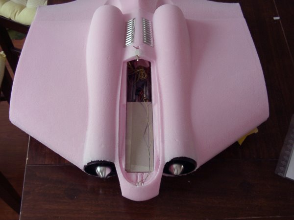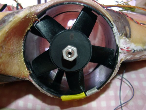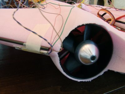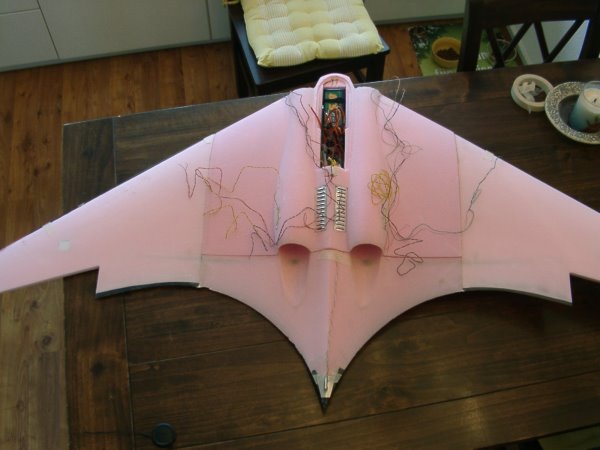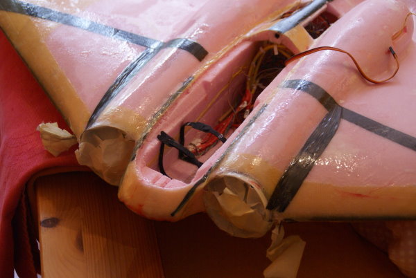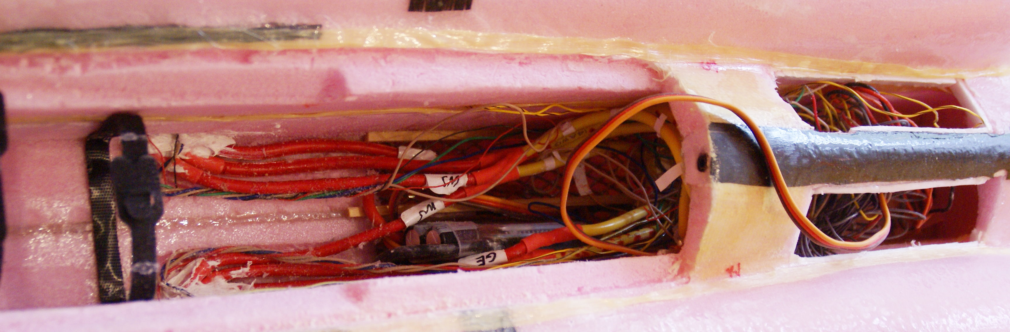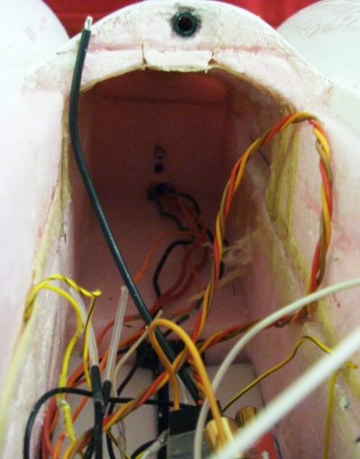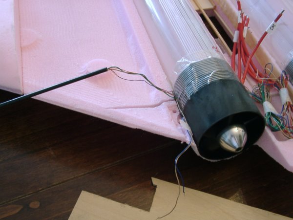 Die Kabel der seitlichen Antikollisonsblitzer gehen durch die Wandung der Düsen, schmiegen sich zwischen den Impellerröhren und der Innenseite der Schaumstoffröhren an und laufen diagonal im Rumpf nach vorn.