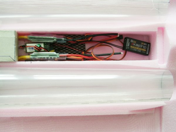 Dummerweise gingen schnell die Optionen aus, denn der Akku geht von der vordersten Kante der Horten fast bis zum Schwerpunkt. Die logische Konsequenz war, die Horten im vorderen Rumpfbereich mehrstöckig zu nutzen. Durch die fulminante Armierung des Bodenbereichs konnte ich das komplette Styrodur raus schaben. In das Aramid am Boden habe vorne zwei Löcher geschnitten und dort die Regler so eingeharzt, dass die Regler nun die Außenhaut der Horten bilden und vorbildlich gekühlt werden. Hinter dem Akku kam jetzt nur noch der Empfänger und die anderen leichten Elektronikkomponenten. Das BEC habe ich aus Gewichtsgründen ebenso eingespart wie die Diodenplatine. Dafür war der Platz zu kostbar. Das Unilog mit dem Stromsensor (es sollte noch ein Staurohr-Sensor und ein Drehzahlsensor mit rein) habe ich durch ein leichteres UniSensE ersetzt.