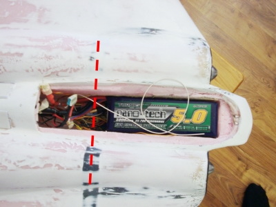 Die rote Strichellinie markiert den Schwerpunkt. Sehr gut sind die Regler zu sehen. Ich habe alle Kabel nur so lange wie unbedingt nötig gemacht. Zeitweise mußte ich dadurch mit einer Pinzette im Rumpf herum löten.
