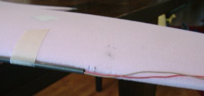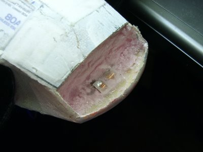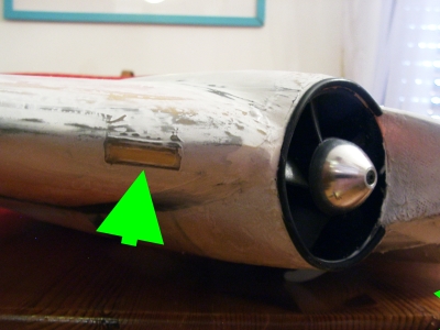 Die hintere Positionsleuchte war etwas "tricky". Mit einem dünnen Stahldraht habe ich vom Bürzel aus schräg Richtung Rumpfinnenbereich gebohrt, bis ich dort heraus kam. Aus einem Segment einer alten Stabantenne habe ich ein Röhrchen genommen und an den Kanten ein paar Sägezähne hineingefeilt. Diesen Bohrer habe ich drehend über den Stahldraht gesteckt und dann weiter drehend ein paar Zentimeter in den Schaum gebohrt. Der herausgespante Schaumstoff landet dabei im Antennenröhrchen und muss immer wieder mit einem Draht herausgenommen werden, damit der Bohrer nicht verstopft. Auf diese Weise habe ich ein sehr sauberes Bohrloch bekommen. In dieses Loch habe ich ein ABS-Röhrchen geklebt, durch das die Kabel geführt werden können.