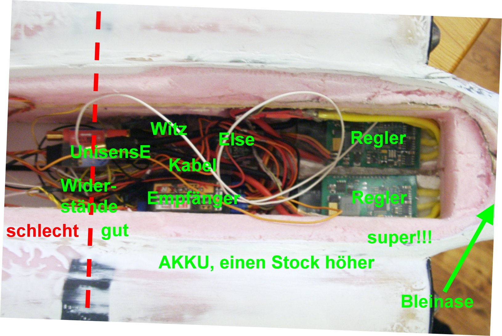 - Die Kabel für die Servos nicht wie angegeben führen, sondern gleich vorne zur Nasenleiste bringen (Hebel verkürzen).