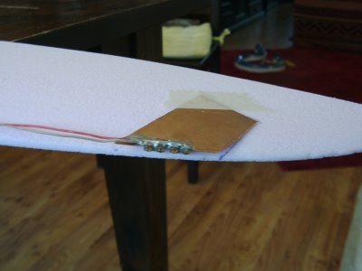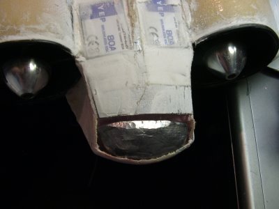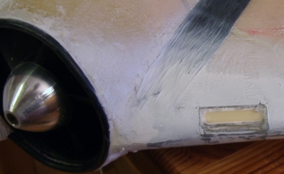 Später mußte ich erkennen, dass ich noch weitere 100g Gewicht in der Nase brauche. Ich habe das so realisiert, dass ich Bleistreifen auf der Unterseite der Nase aufgeklebt habe, diese mit 80g Glasgewebe laminiert und verspachtelt habe.