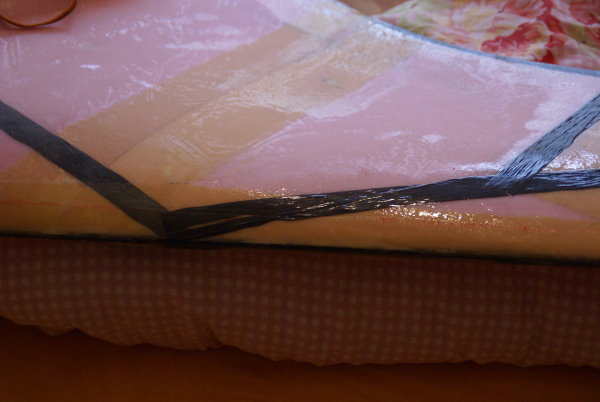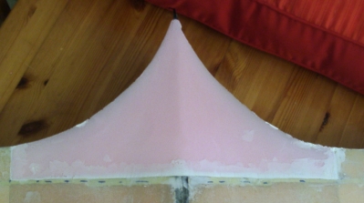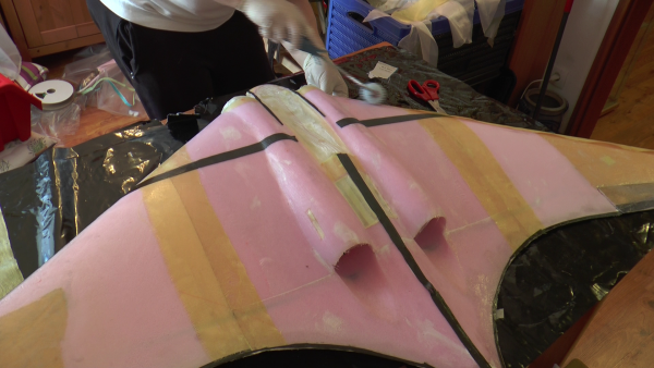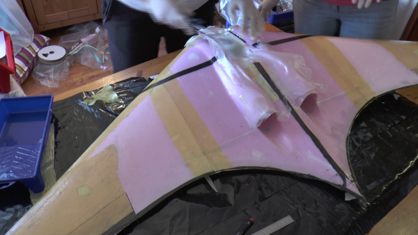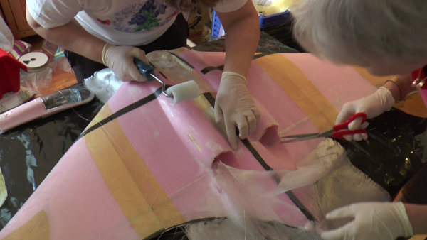Hier bringe ich das 25g-Gewebe auf. Dieses ist nicht so "geländegängig", d.h. es müssen kleinere Stücke verwendtet werden und auch einige Schnitte in das Gewebe geschnitten werden, um Falten zu vermeiden. Schlimmer ist aber, das ich nicht bedacht hatte, dass ich beim Verschieben des 25g-Gewebe automatisch das noch glatte 80g-Gewebe verschiebe. Es entstehen Falten in der Unterschicht, die nicht mehr entfernt werden können. Das Unheil nimmt seinen Lauf...
