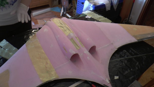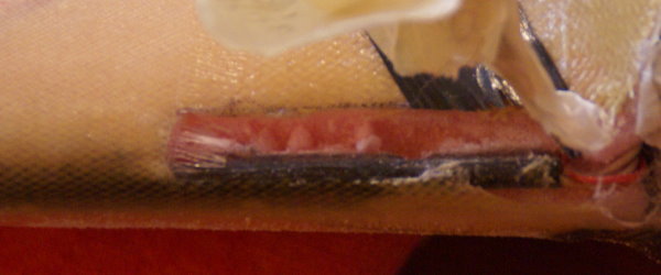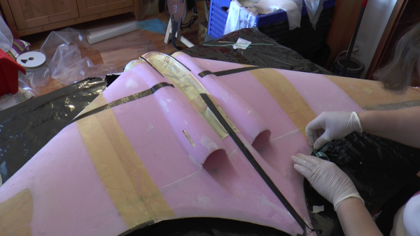 Hier bringe ich als Stoßabsorber an den Nasenleisten Aramidsteifen (45° Lage) auf.