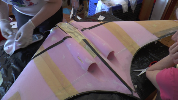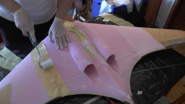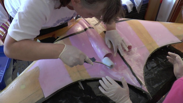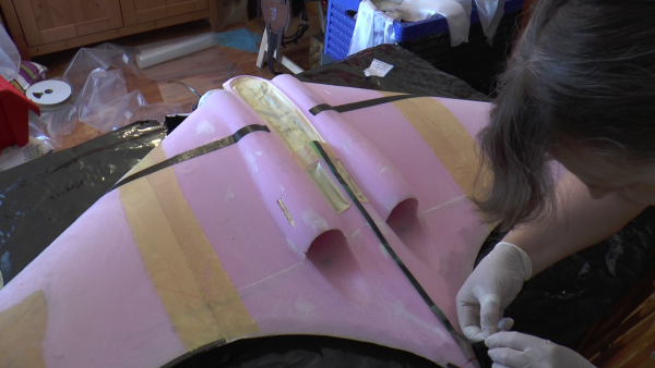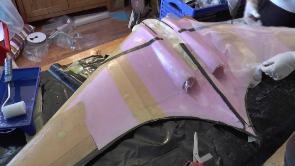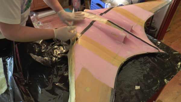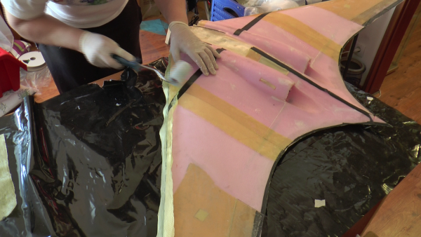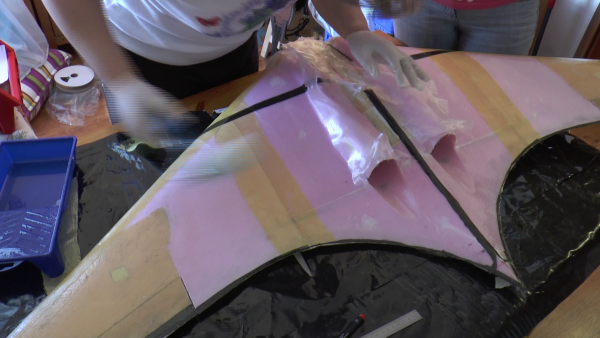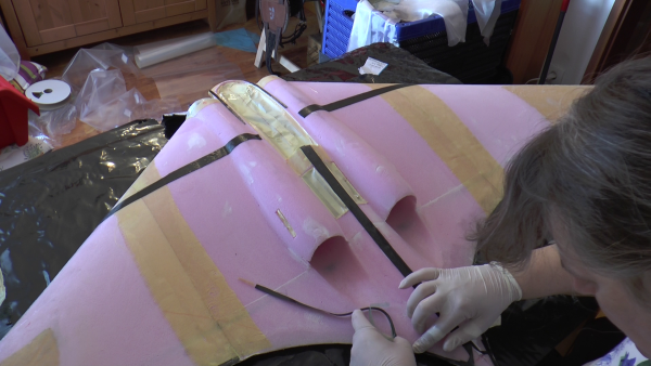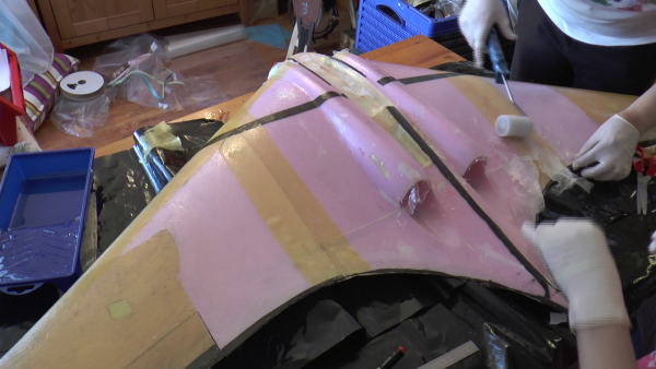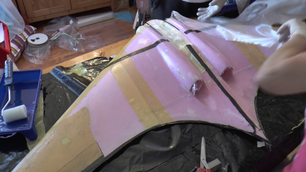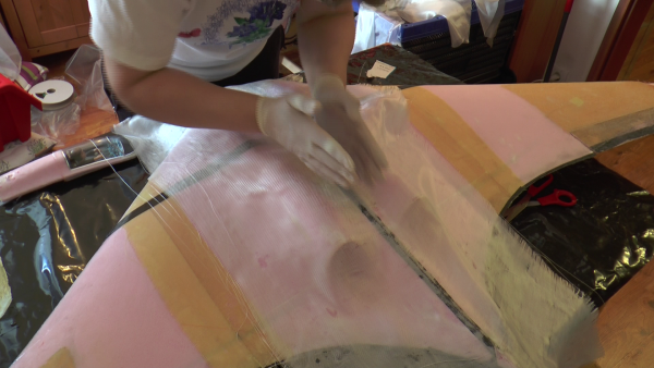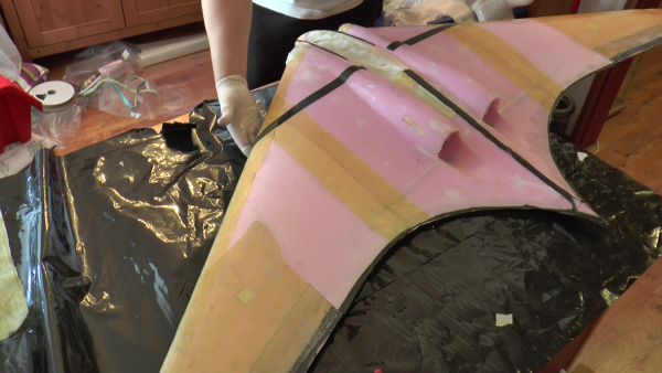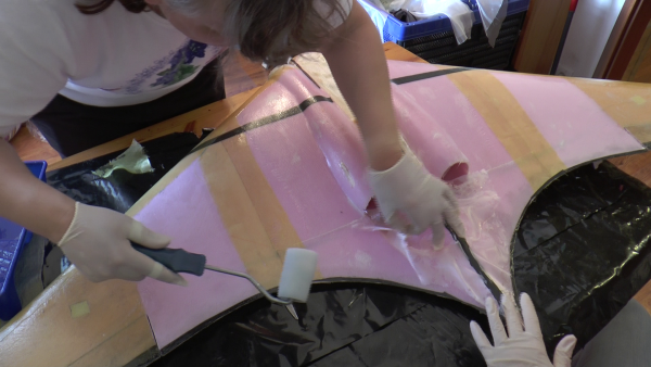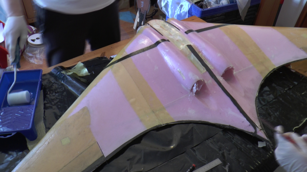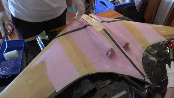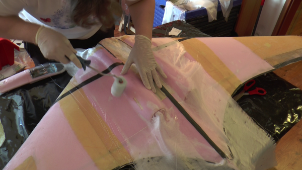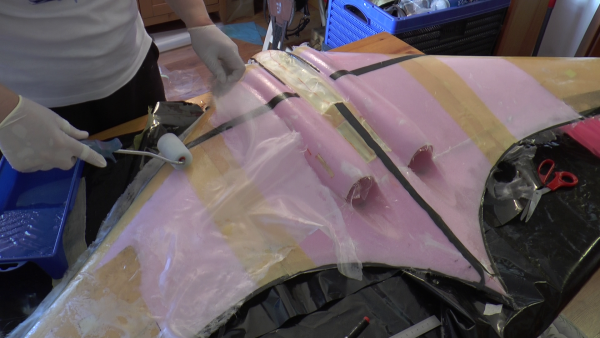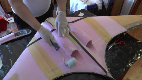 Das UD-Carbon wird mit dem Epoxid-Roller benetzt und anschließend auf die Oberfläche aufgebracht. Hier die seitliche Versteifungen: