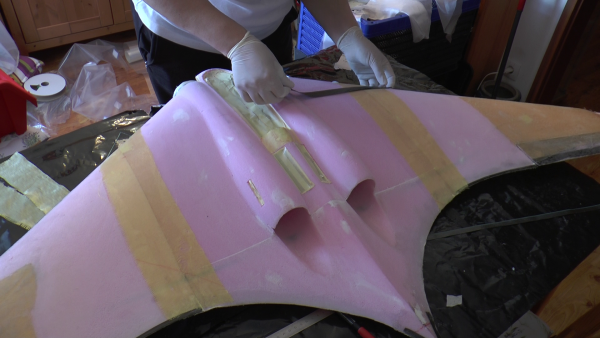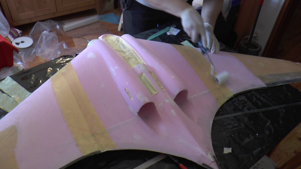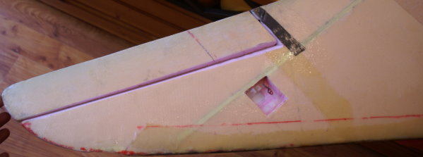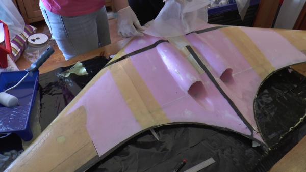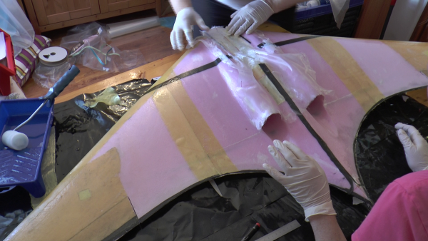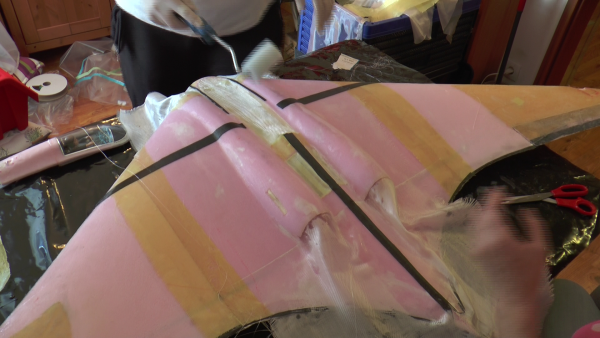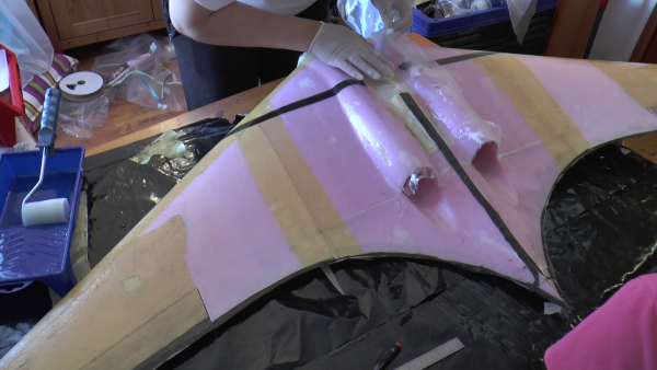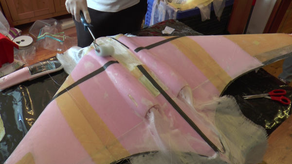 Hier laminiere ich das 25g-Gewebe auf die Tragfläche auf.