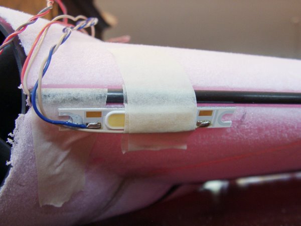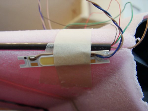 Die Landenscheinwerfer sollten leicht nach vorne unten strahlen. Um die Thermik der LED-Module zu verbessern, habe ich die Module mit Wärmeleitkleber auf die Kohlefaserholme der Nasenleiste geklebt. CFK ist zwar bezogen auf Metall ein schlechter Wärmeleiter, aber dennoch ein brauchbarer Kühlkörper, wenn Metall gerade nicht vorhanden ist. Das ist gut, denn ich wollte die Landescheinwerfer gerne hinter einer Klarsichtabdeckung betreiben.