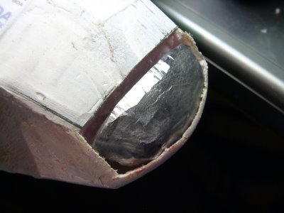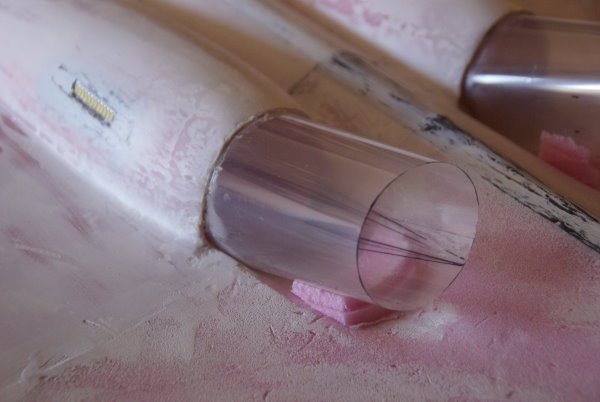 Und wieder ein paar graue Haare. Eigentlich wollte ich die Schubrohrverlängerungen zwischen die inneren Kunststoffröhren und der Schaumstoffaußenwand schieben. Die Schubrohre sollten laut Wemotec einen Auslass von 55mm haben. Um einen geraden Kegelstumpf zu erhalten, habe ich entsprechend gerechnet und runde Konturen in der Abwicklung der Folie gezeichnet. Bis dahin war alles in Ordnung und gut. Ich habe aber ums Verrecken die Kegelstümpfe nicht sauber hinter die inneren Kunststoffröhren bekommen. Irgendwann fiel mir ein, dass ja der letzte Teil der Auslässe gekrümmt ist. Damit kann ein gerader Kegelstumpf gar nicht passen (oder man hat einen Fehler gemacht - oder man hat eine neue Geometrie erfunden, bekommt den Nobelpreis für Mathematik und lässt in Zukunft die Horten bauen :-)).