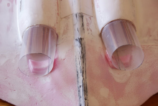 Alles noch einmal zurück auf Anfang. Ich habe die Schubrohrverlängerungen daraufhin am Ende der Düsenauslässe befestigt (Uhu-POR) und die Stützen drunter geklebt.