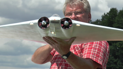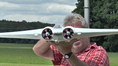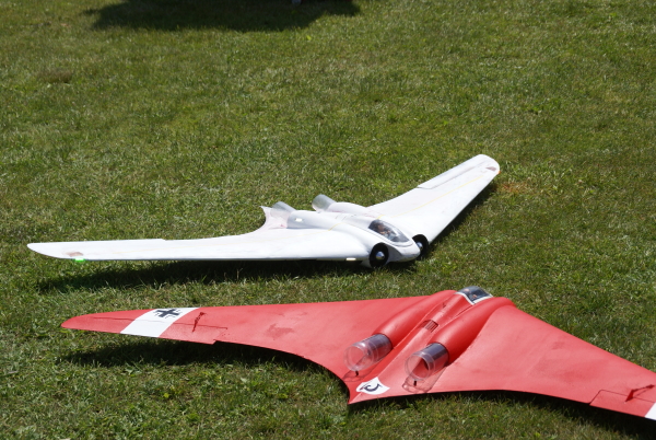 Meine Horten verliert in der Kurve noch viel Höhe. Da muß ich an der Querruderdifferenzierung noch was machen. Die Schubvektorfunktion hat kaum Wirkung. Ich bin mit 40% geflogen. Diesen Wert werde ich wohl erhöhen. Der Sound ist mit den Wemotec-Impellern sehr gut. Allerdings kann ich derzeit keinen Unterschied zwischen Halbgas und Vollgas feststellen. Da muss ich wohl noch einmal ein GPS einbauen.