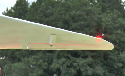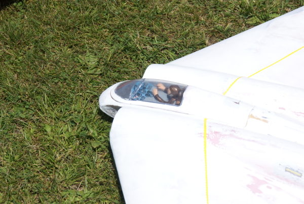 Die Cockpitbeleuchtung bei voller Sonneneinstrahlung. Sie ist immer noch gut sichtbar. Auf den Tragflächen habe ich aus Gewebeisolierband und einem Rollenschneider mit Wellenklinge Turbulatoren aufgeklebt.