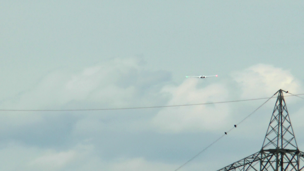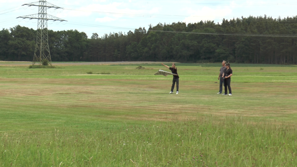 Die Landung. Da der Wind aus Südwest kam, musste ich zwischen zwei Wäldchen und einem Hochspannungsmasten die Fuhre vorsichtig reinzirkeln, dabei Höhe abbauen und den Platz treffen.
