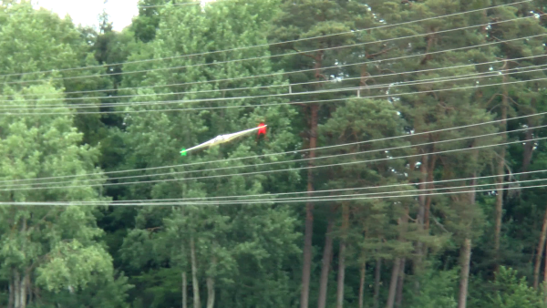 Hier das Video vom Erstflug. Kameramann war Indy. Die Startphase habe ich mit zwei Kameras und einer Zeitlupe noch einmal verdeutlicht. Die Flugzeit war ziemlich genau 5Minuten. Der Stromverbrauch war 3678mAh (UnisensE). Bei dem Erstflug hatte ich einen Maximalstrom von 114A. Die maximale Drehzahl der Impeller war 45000U/min. Maximalhöhe 192m über Grund. Der Akku ist bis auf 13,76V eingebrochen.