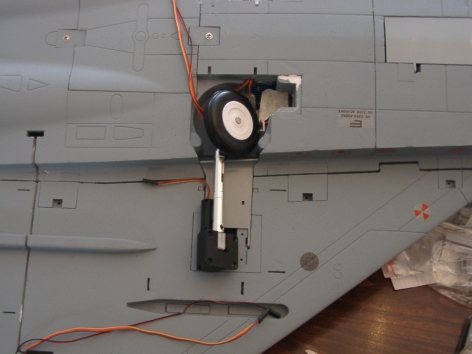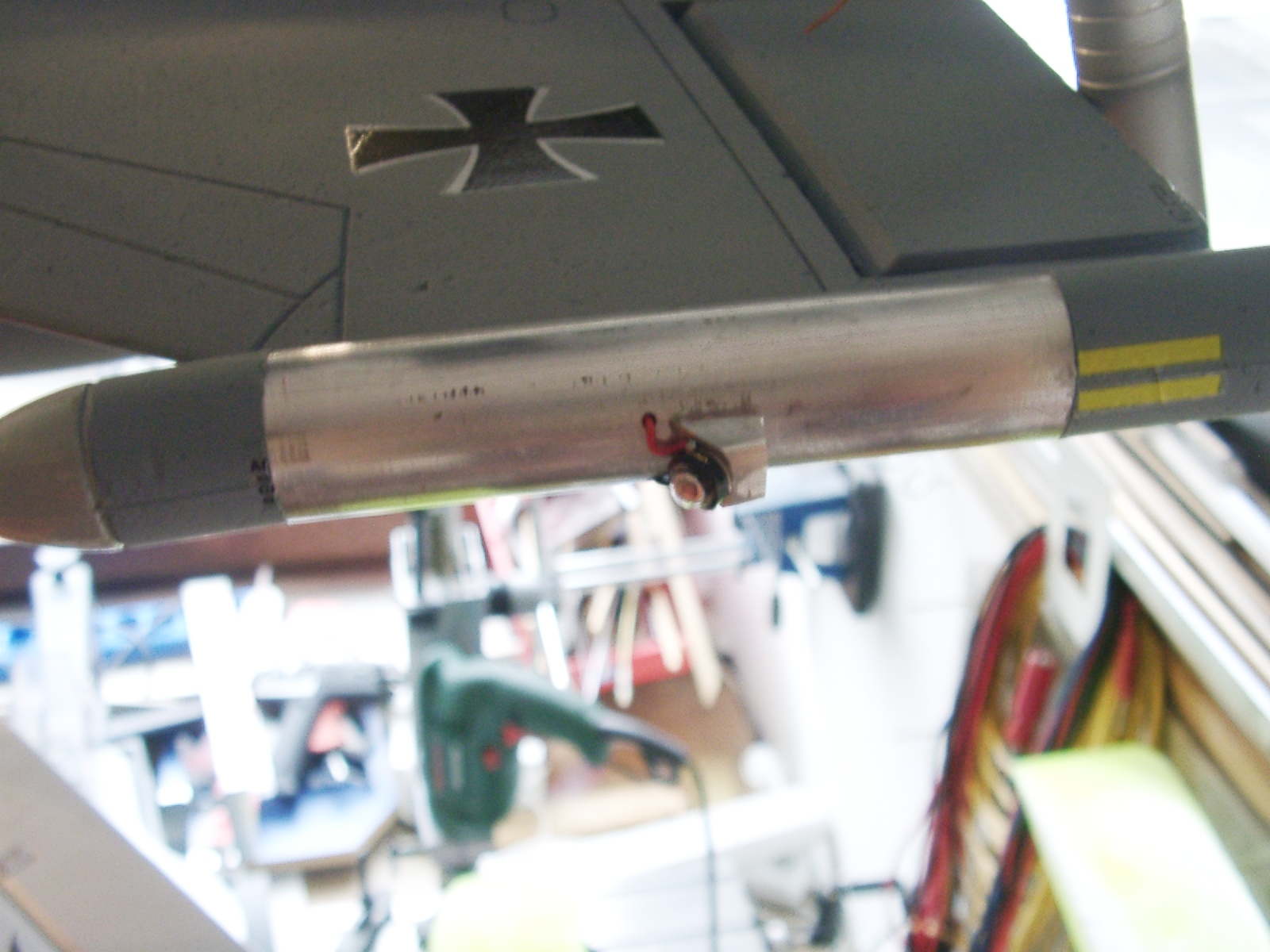 Die original-Gondeln werden von der Tragfläche abgetrennt. Der vordere und der hintere Teil wird an das Alurohr geklebt und die so entstandene Gondel wieder an die Tragfläche geklebt. Die Kabel laufen im Rohr und gehen von dort in die Nut der Tragfläche über. Später wird eine Tiefziehkuppel die LED bei Landungen schützen.