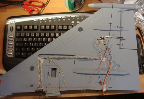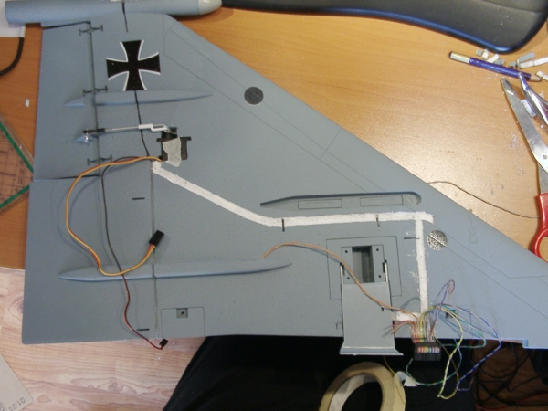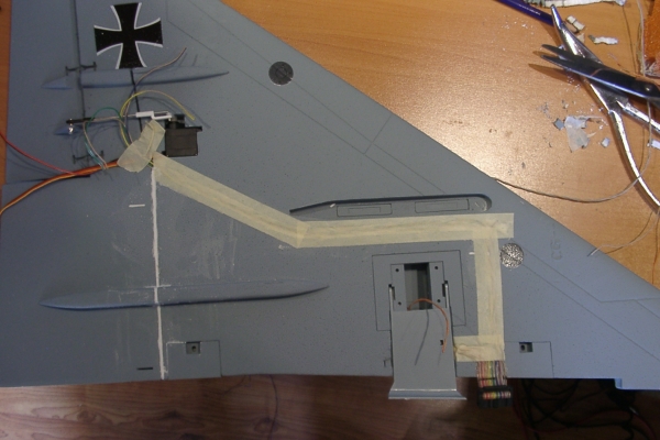 Bei der Gelegenheit habe ich auch noch gleich die Kabel neu verlegt. Warum soll das Servokabel der Querruder so zum Rumpf laufen, um dann im Rumpf wieder nach vorn zu laufen. Kupfer ist schwer und je länger ein Kabel ist, desto leichter fängt es sich Störungen ein. Als Kabel habe ich paarweise verdrilltes Flachbandkabel benutzt. Jede Versorgung hat seine eigene Masse die verdrillt ist, jedes Servosignal hat eine separate Masse, die ebenfalls mit dem Signal verdrillt ist.