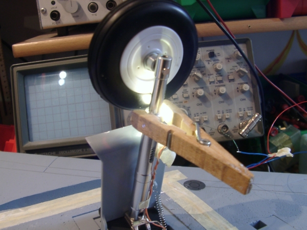 Hier sieht man eine Tragfläche auf der ich gerade eine Osram Oslon (weiß) als Landescheinwerfer mit Wärmeleitkleber auf das Alu-Fahrwerk geklebt habe. Das Federbein ist gleichzeitig der Kühlkörper für die LED. Die LED wird mit 400mA betrieben.