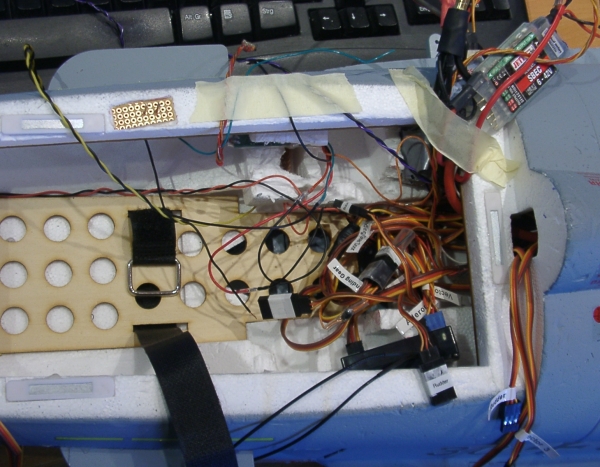 Auf dieser Seite ist die Steuerung des Einziehfahrwerks und die Steckverbinder zu den Flügeln sichtbar.