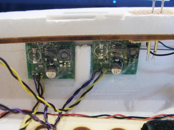 Da das Cockpit fünf unterschiedliche Stromkreise hat, die mit einem Widerstands-Cluster an einer Konstantspannung von 12V arbeiten, brauchte ich ein BEC. Im ersten Ansatz habe ich von Hobbyking ein BEC gefunden, das auch neben den 5V die benötigten 12V liefert.