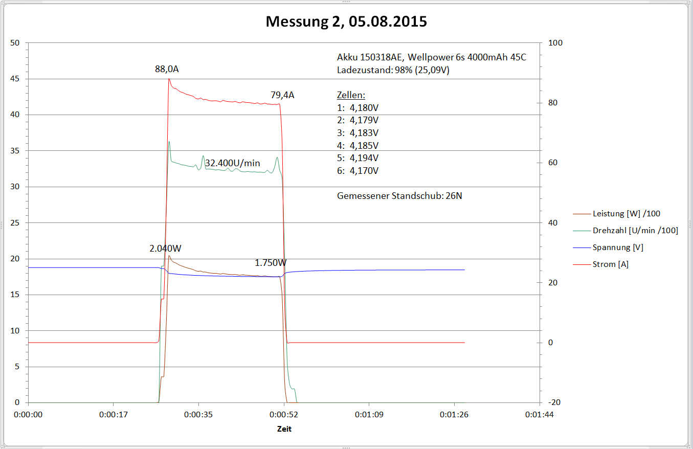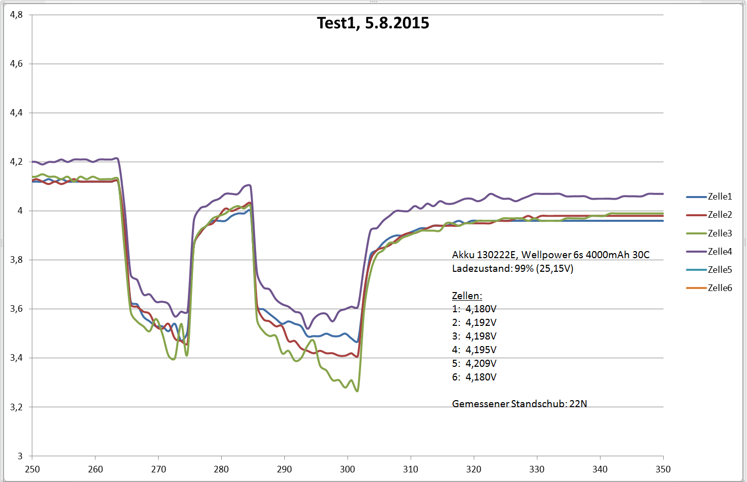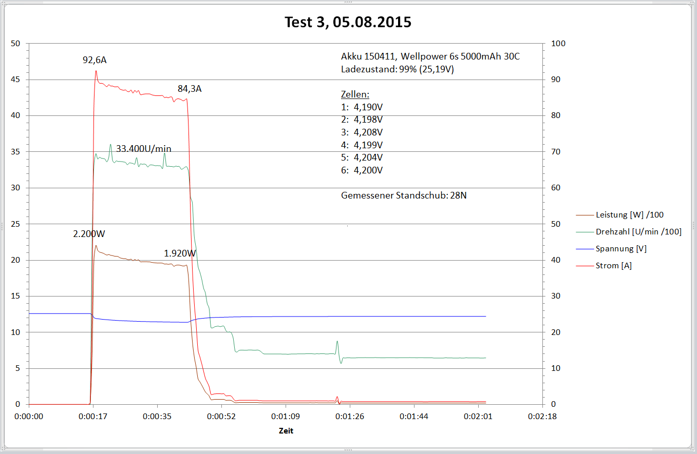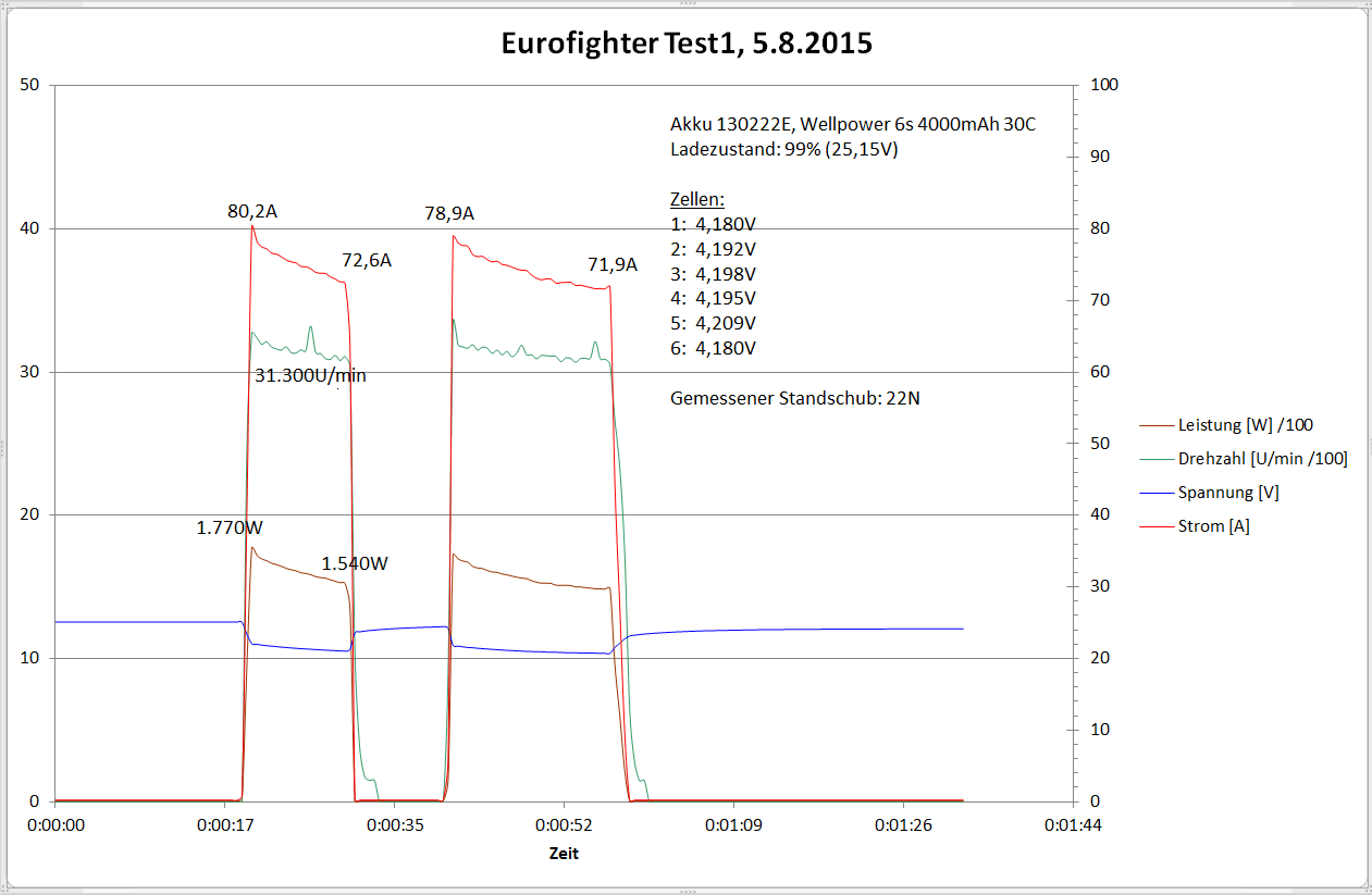 Nun zu den versprochenen Akkutests. Ich habe insgesamt drei Akkus under identischen Bedingungen einem Standschubtest von 30 Sekunden unterzogen. Ziel der Messungen war herauszufinden, wie groß der Einfluss des Akkus auf den Antriebsstrang der Eurofighter ist. Um es vorweg zu nehmen, die Wahl des Akkus wirkt sich spührbar auf das Startverhalten aus.