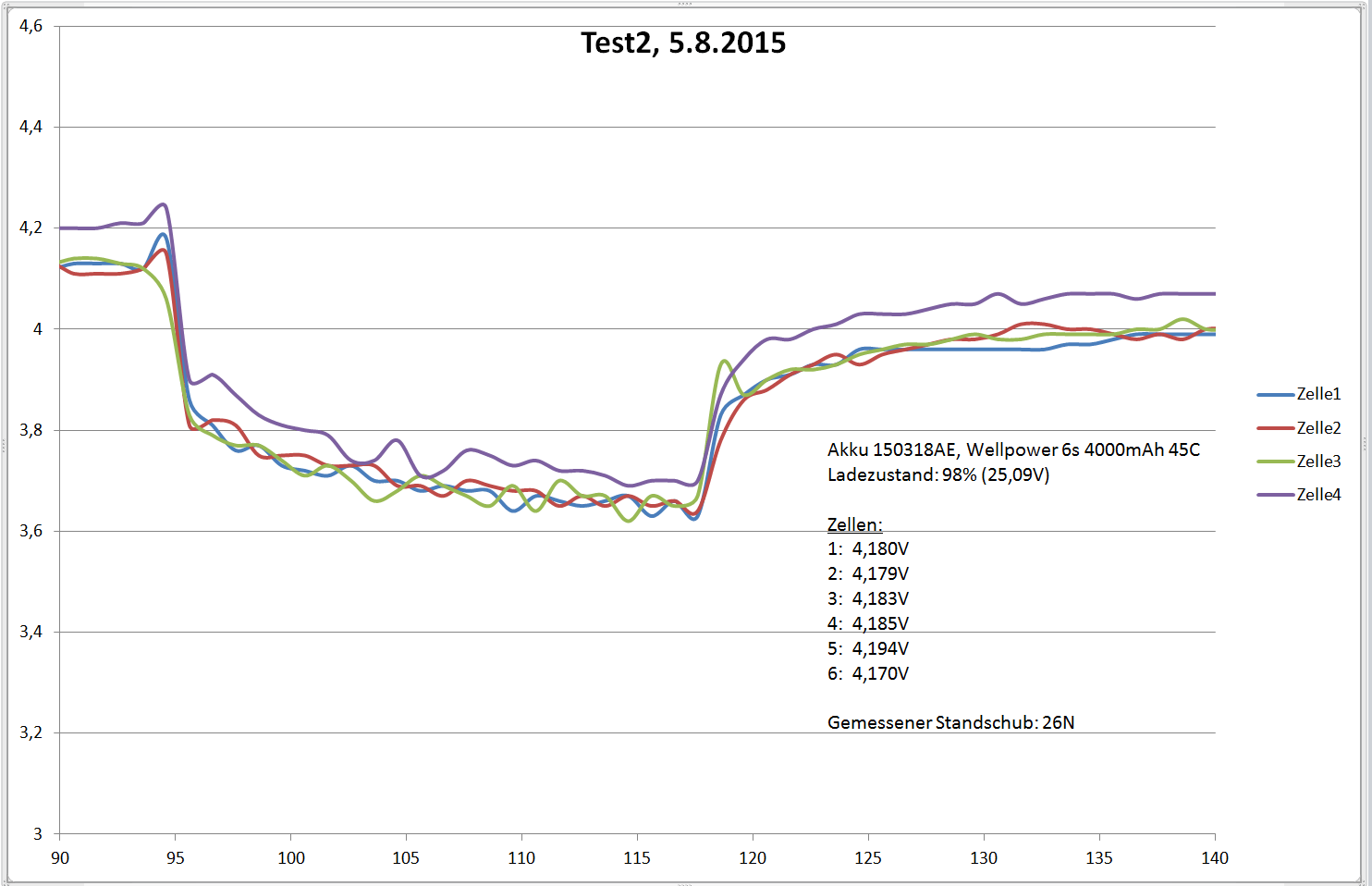 Hier sind die vier ersten Zellen des Akkus aufgeführt. Wesentlich ist der Einbruch der Spannung im Durchschnitt auf 3,7V. Insgesamt sind die Zellen sehr homogen beieinander.