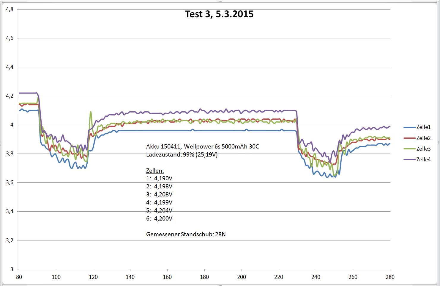 Nun die Zellen von Versuch 3: Hier ist die Spannungslage nochmals höher: 3,8V