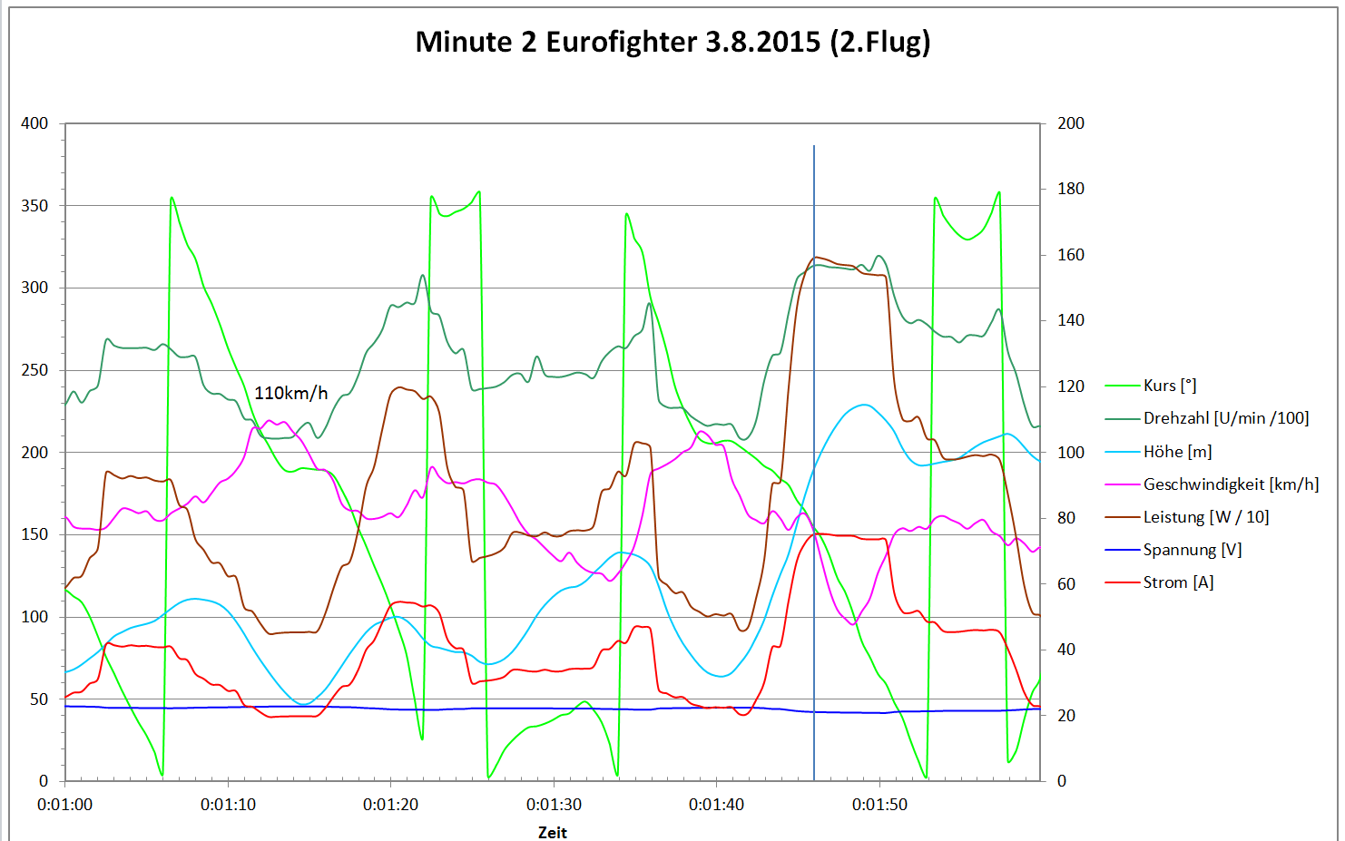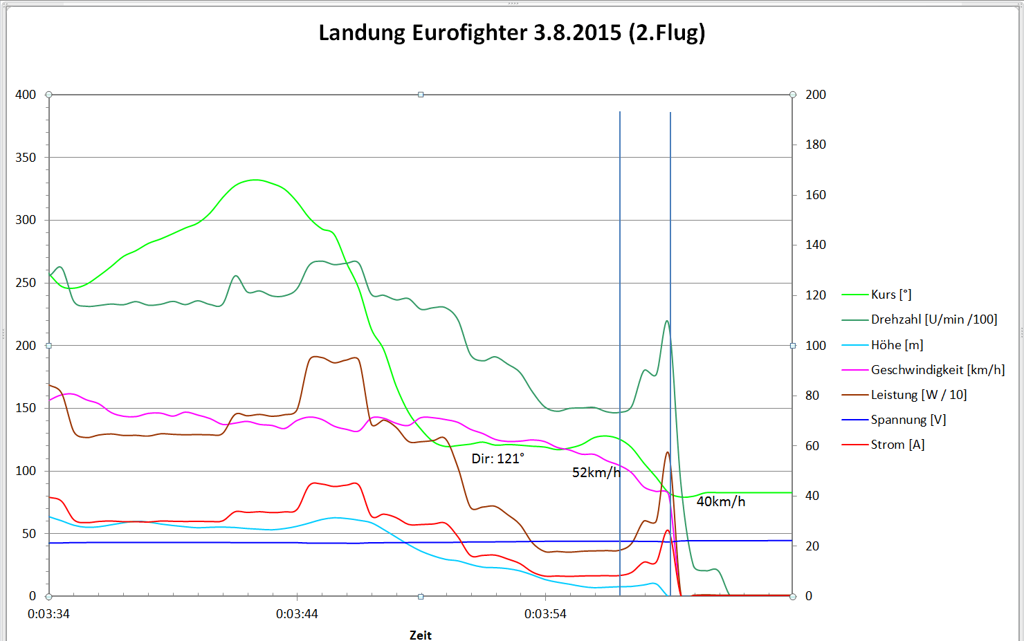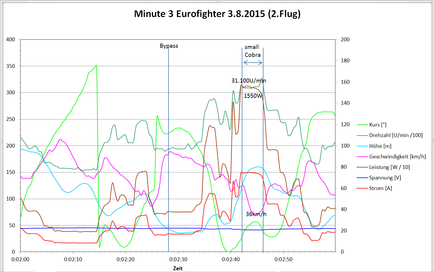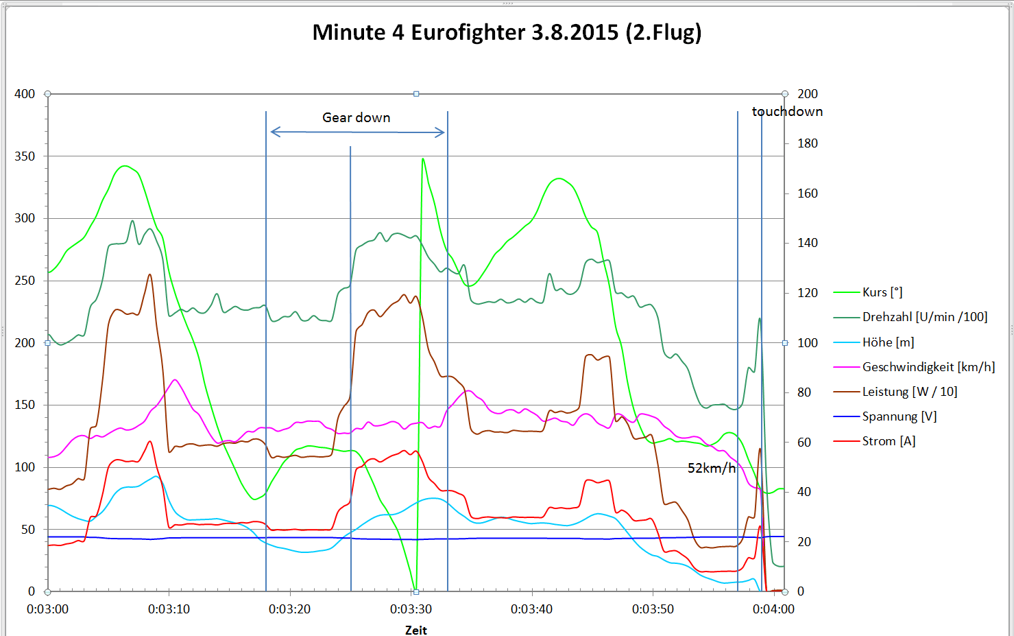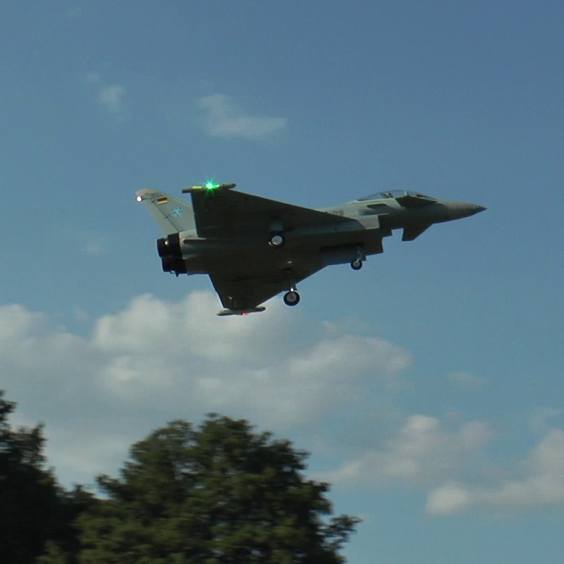 Die Eurofighter ist kein Segler. Ist der Motor aus oder läuft auf Schleppgas, so geht die Fuhre mit 3,6m/s abwärts. Die Steigleistung war auch nicht gerade berauschend und lag bei 3m/s. Später die Erklärung dazu. Nach dem Start kann das Gas auf 1/2..1/3 zurück genommen werden. Ich habe für die 4 Minuten Flug eine mittlere Leistung von 818W ermittelt. Der mittlere Strom lag bei 38A.