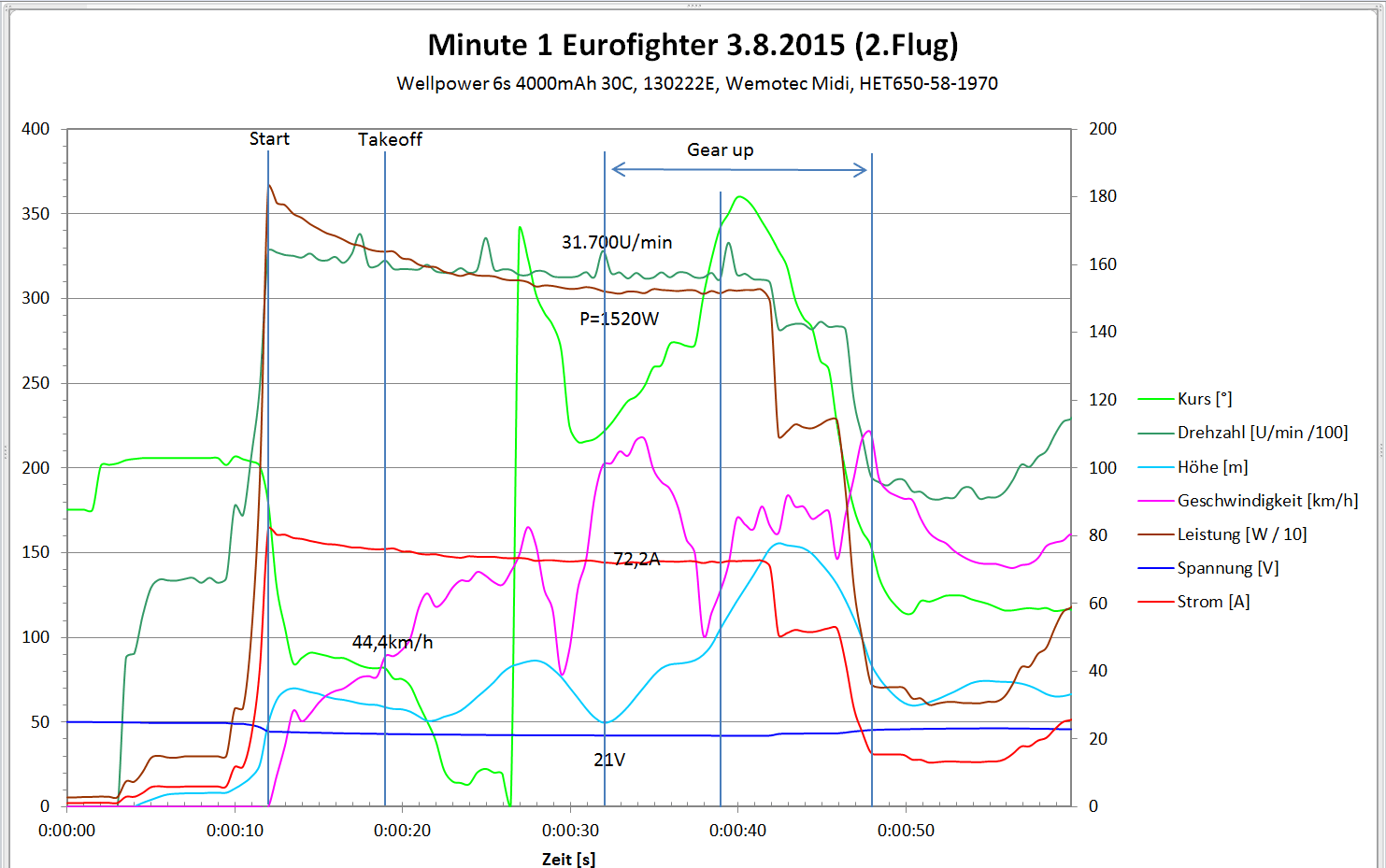 Wenn man sich dann einzelne Bereiche des Logs ansieht, kommen doch einige Erkenntnisse heraus. Hier der Start. Die Abhebegeschwindigkeit lag bei 44km/h. Ein Rätsel ist mir die Höhenangabe. Sowohl der GPS-Höhenmesser als auch der Unisense-Höhenmesser zeigten beim Start unglaubwürdige Werte an. In der Startphase sieht man, wie die Leistung von 1829W auf 1520W einbricht. Die Drehzahl des Impellers lag bei 31.700U/min. Der Strom lag bei 72,2A, Peak wurde 82A gemessen.