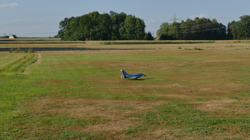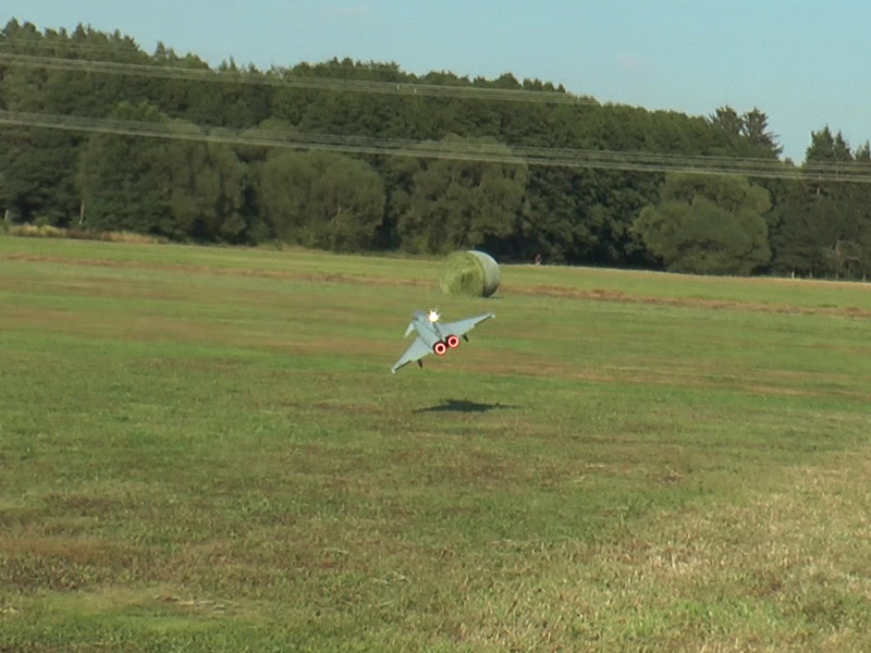 Und spätestens da habe ich es mit ein paar Pilotenfehlern verrissen: Zum einen bin ich zu hoch rein, da auf der Wiese noch Heurollen standen. Das wäre noch in Ordnung gegangen, wenn ich nicht versucht hätte meine Eurofighter diagonal über den Platz zu Landen um mehr Bahn zu haben und natürlich bald aufzusetzen, um keinen Platz zu verschenken.
